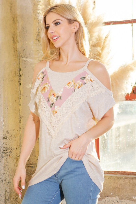 Cold Shoulder textured top with flower print contrast and lace trim detail.