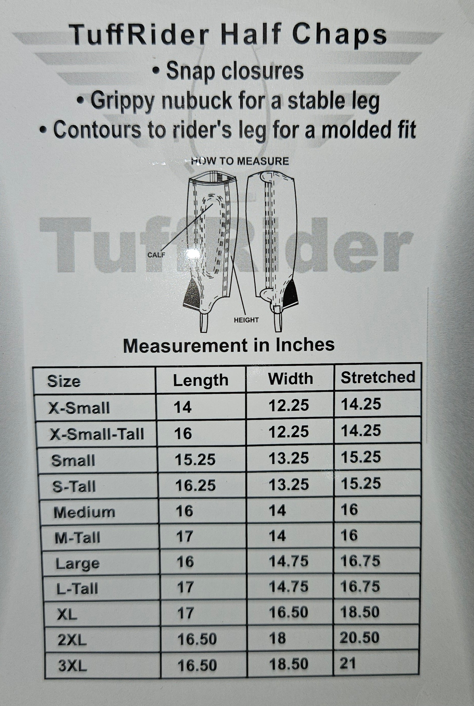 TuffRider Grippy Nubuck Half Chaps are ideal for daily schooling and training. They are made with material that allow the chaps to take the proper shape of your legs. With their high cut profile and contour design, they look and feel like your tall boots.