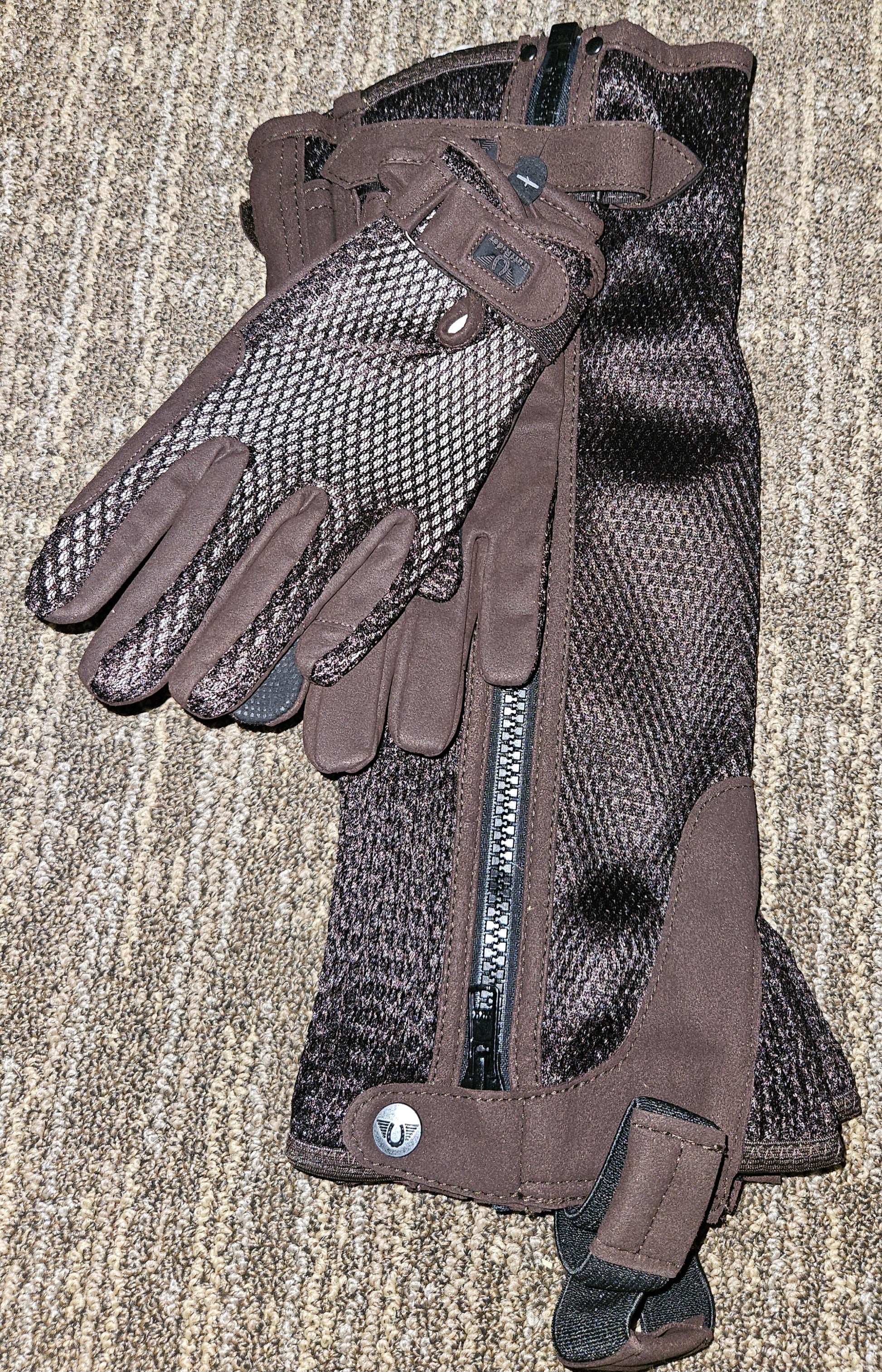 The TuffRider Ladies Double Up Air Mesh Half Chap and Glove Set is a great schooling set that is as easy as it is stylish. Made with a combination of mesh and synthetic leather, this set is washable and comfortable. The air mesh fabric of the half chaps and gloves keeps you cool while the inner panel aides in grip and leg stability. The half chaps are completed with a side zip and snaps for easy on and off while the gloves have a hook and loop wrist closure for a secure fit. The air mesh gloves are finished with a suede palm and are touch screen compatible. Available in Black or Mocha, this set will match either color paddock boot!